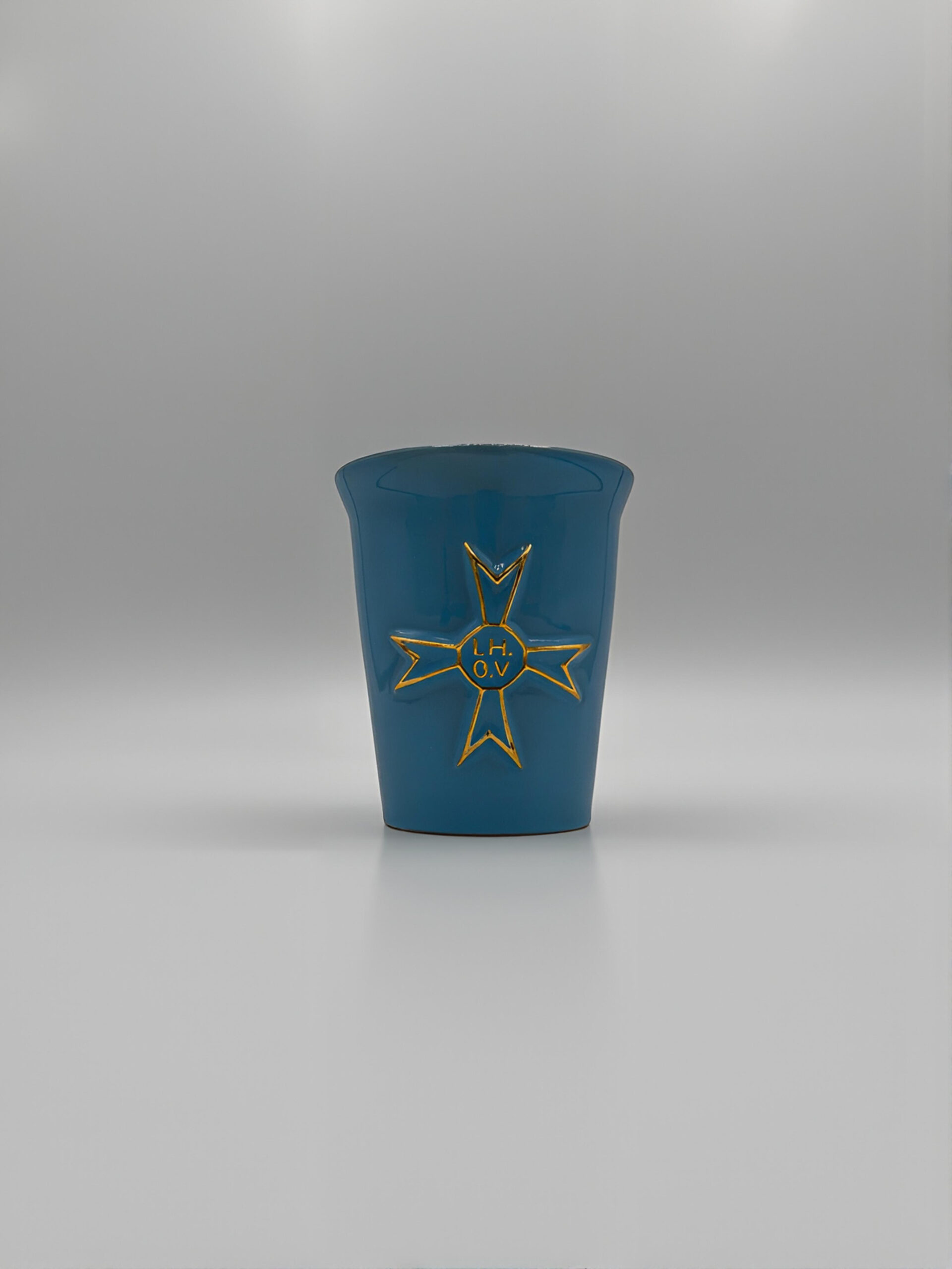 Ritterordensbecher des Weinritterordens aus blauer Keramik, versehen mit dem Ritterkreuz.