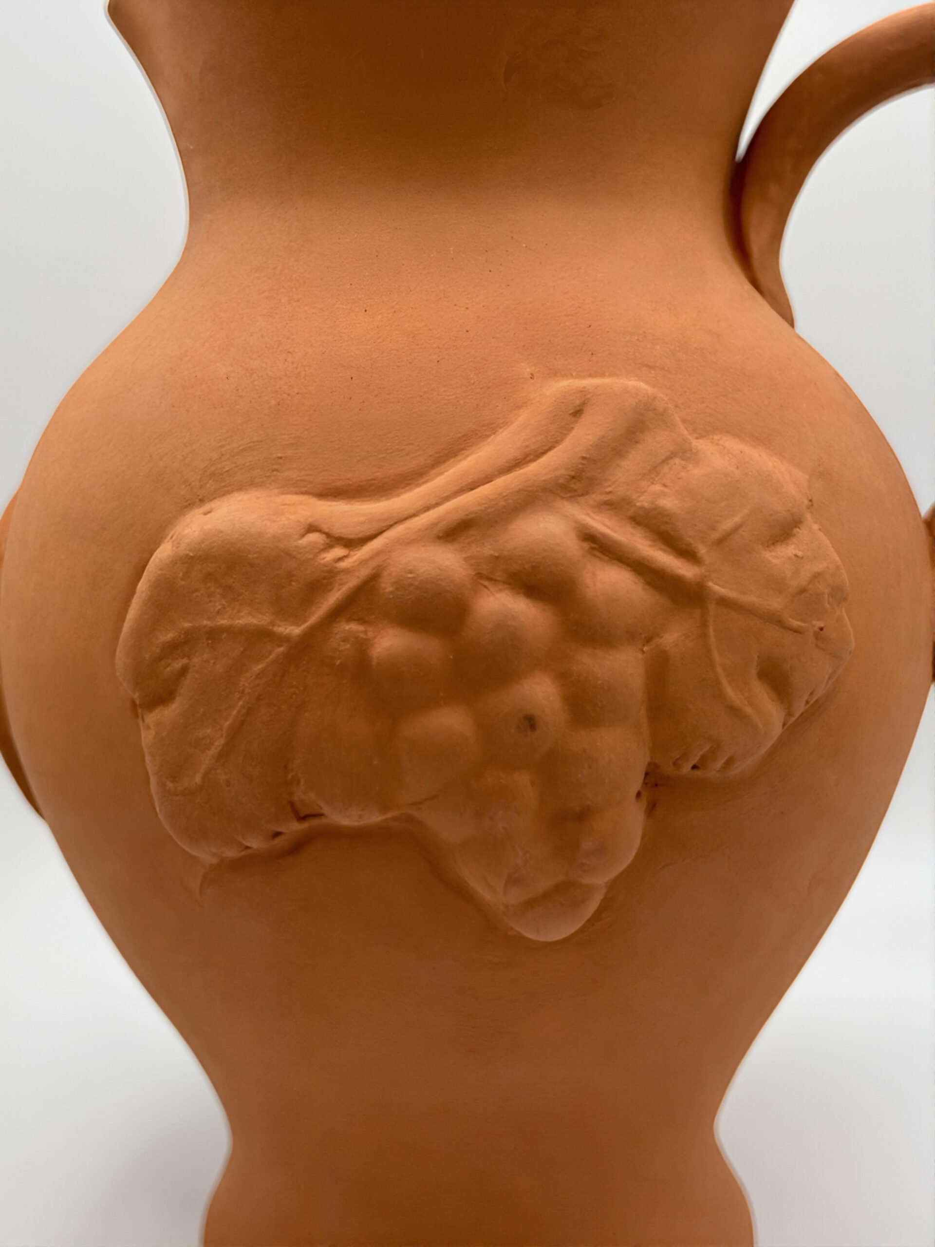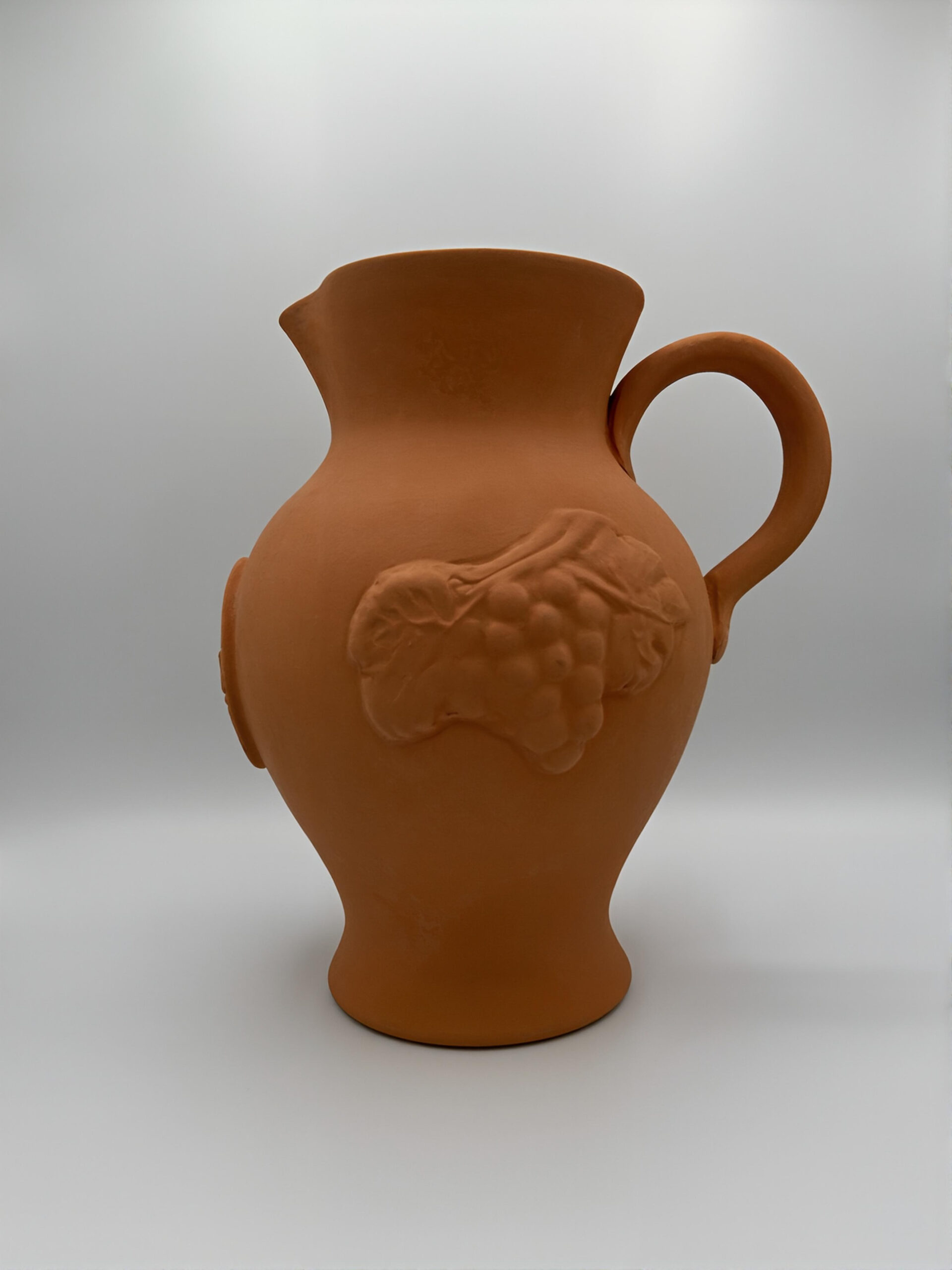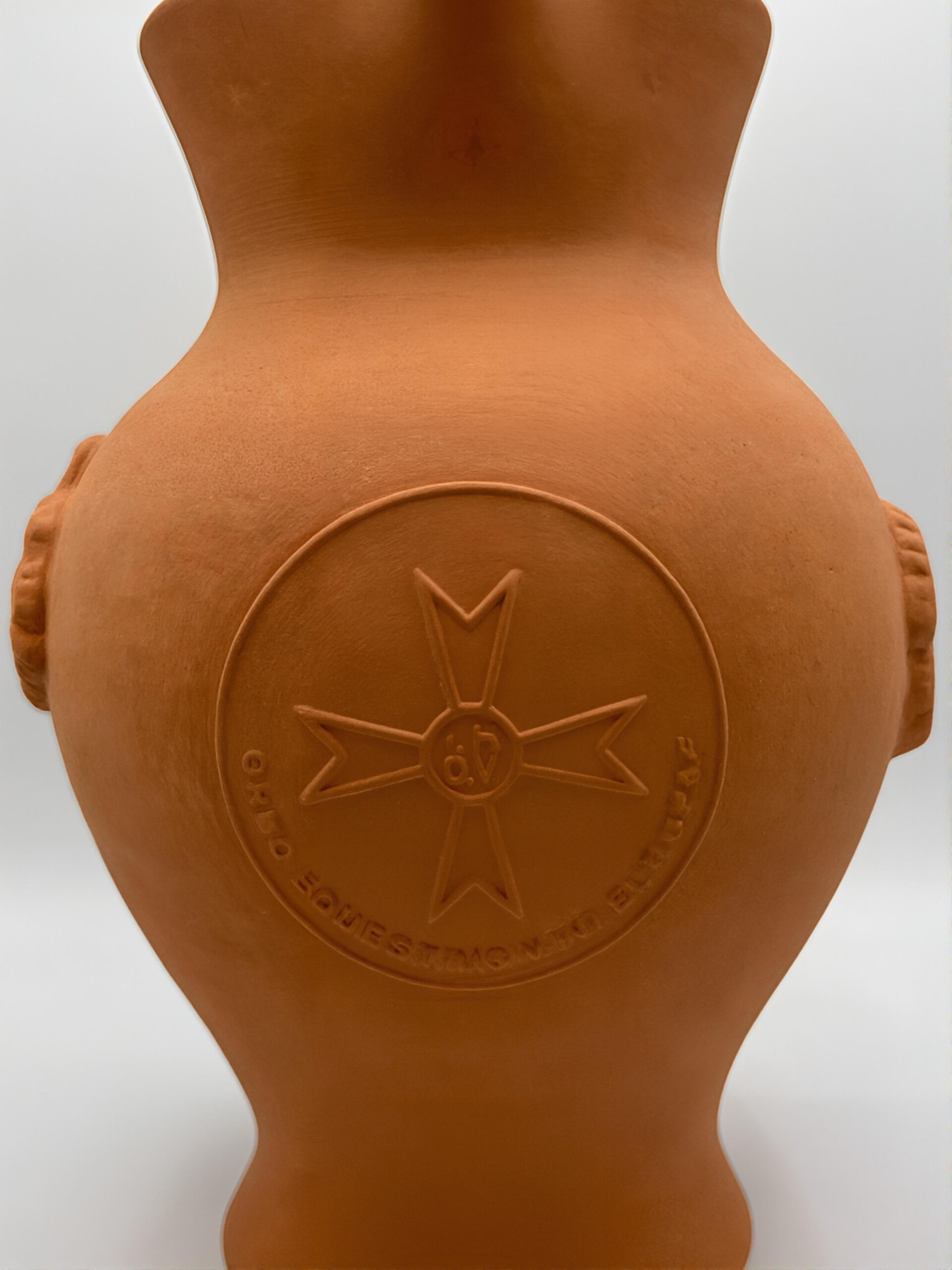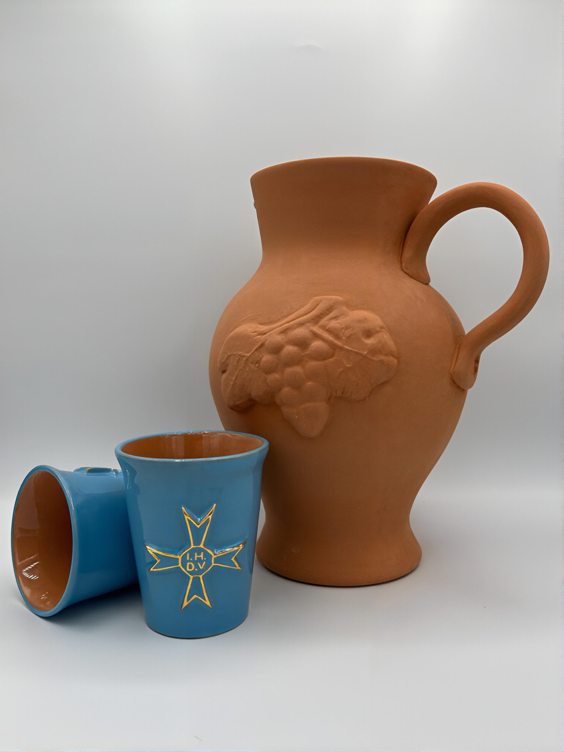 Ritterordenskrug aus Keramik – gefertigt aus naturfarbener, unglasierter Keramik mit klassischen Formen. Der Krug ist mit einer plastischen Weintraube verziert und trägt zudem ein Relief des Ritterordens.